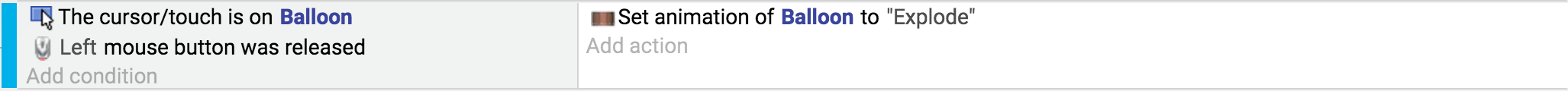 La condición llamada "El cursor / toque está en un objeto" verificará si el cursor del mouse o un toque de pantalla se realiza en un objeto (s) determinado (s).