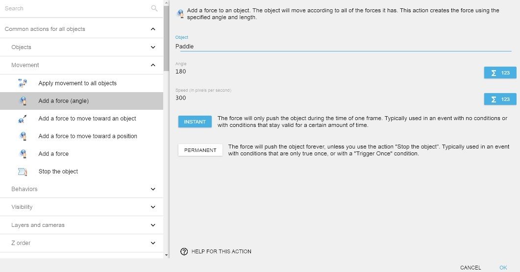 • Haga clic en Acciones comunes para todos los objetos > Movimiento > Agregar una fuerza (ángulo).