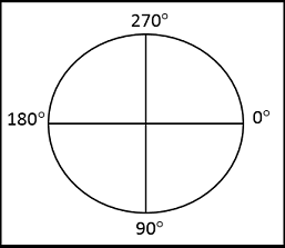 Para mover objetos con una fuerza aplicada, deberá especificar un ángulo. La siguiente imagen ilustra cómo GDevelop entiende el ángulo de rotación. En un eje horizontal, la izquierda es 180°, la derecha es 0°.