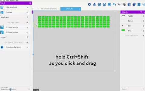 Para acelerar las cosas, haga clic o seleccione objetos, luego mantenga presionada la tecla Ctrl, haga clic y arrastre para replicar instancias en la pantalla. Mantener presionadas las teclas Ctrl+Shift mantiene las nuevas instancias en el mismo eje X o Y.