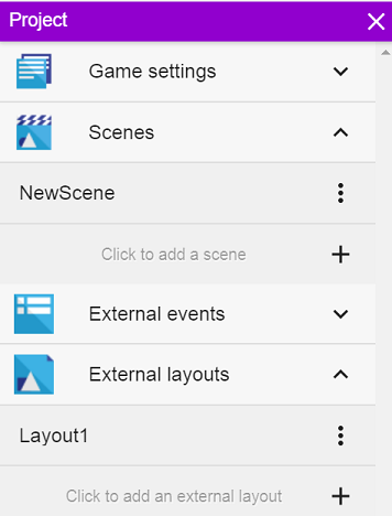 • Haga clic en Layout1. Se le pedirá que elija la escena en la que se incluirá. Elige NuevaEscena: esa es la escena donde ocurre todo el juego. Se abrirá una nueva pestaña que se parece a su NewScene existente.