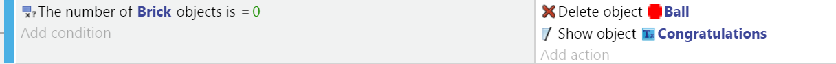* Crea un nuevo sub-evento {{:gdevelop5:tutorials:breakout-game:subevent_button.jpg?nolink|}} para el evento que acabas de crear donde el número de objetos de ladrillo es =0.