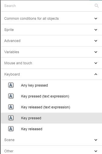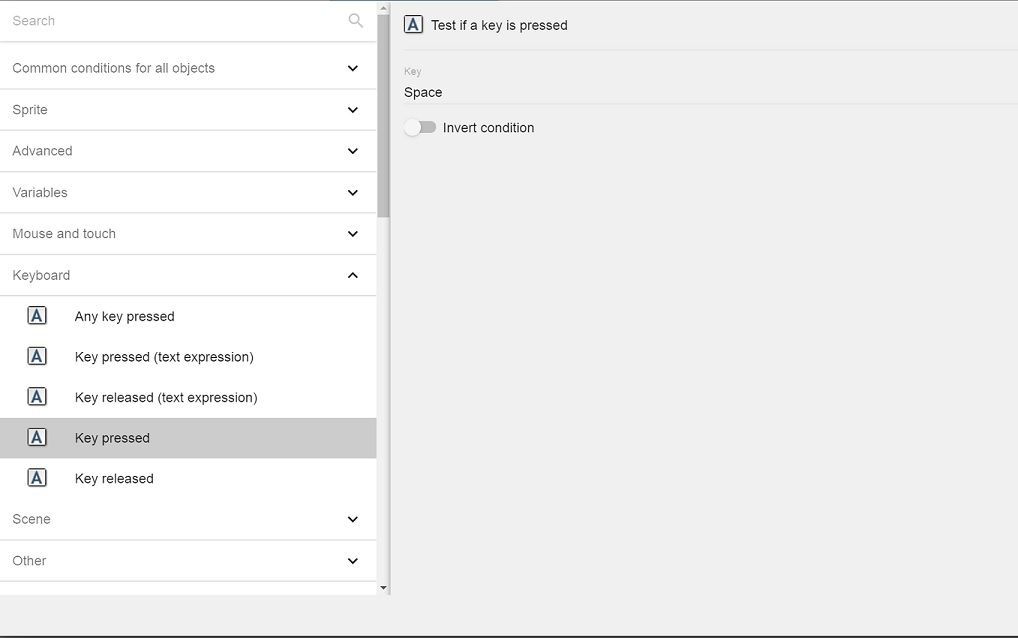 • En el campo Clave, escriba Left y haga clic en Aceptar. Esta condición es verdadera si el jugador presiona la flecha izquierda en el teclado.
