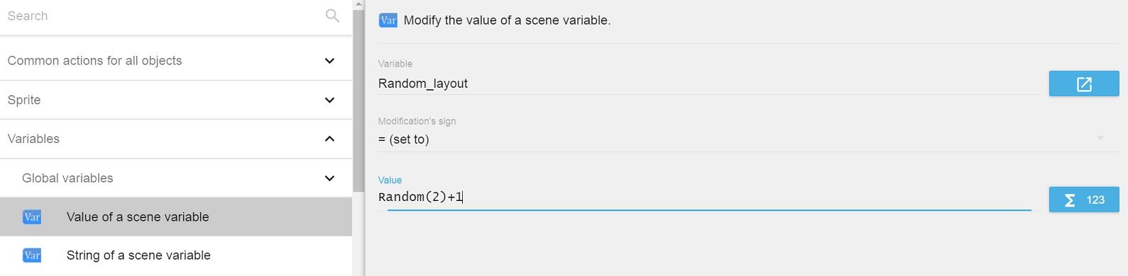 * En el campo **Variable**, escriba **Random_layout** para crear una nueva variable de escena.