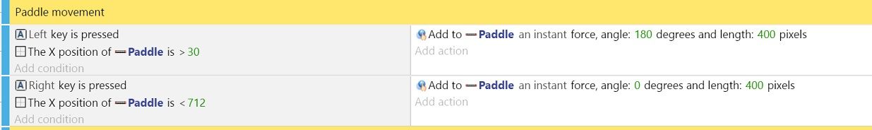 El jugador controlará la pala usando las flechas izquierda y derecha del teclado. Puede crear estos controles usando eventos (acciones que ocurren si las condiciones son verdaderas).