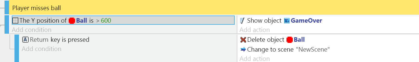 Agregue una acción correspondiente para hacer visible el objeto GameOver. También debe agregar un evento secundario que haga que se elimine la pelota y que el juego se reinicie si el jugador presiona Enter. Agrégalos ahora.