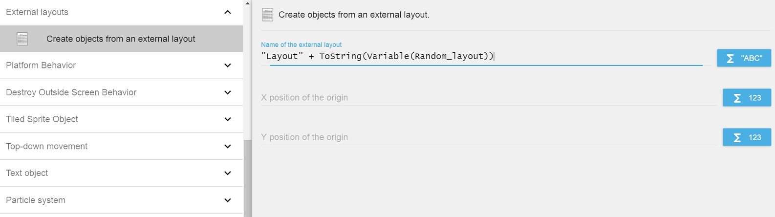 • Agregue otro sub-evento nuevo para el comienzo de la escena, luego haga clic en Agregar acción. * Haga clic en Diseños externos > Crear objetos a partir de un diseño externo. * En el campo Nombre del diseño externo, escriba "Layoutv" + ToString(Variable(Random_layout)). Esto agregará aleatoriamente uno de los diseños externos a la escena. * Haga clic en Aceptar.