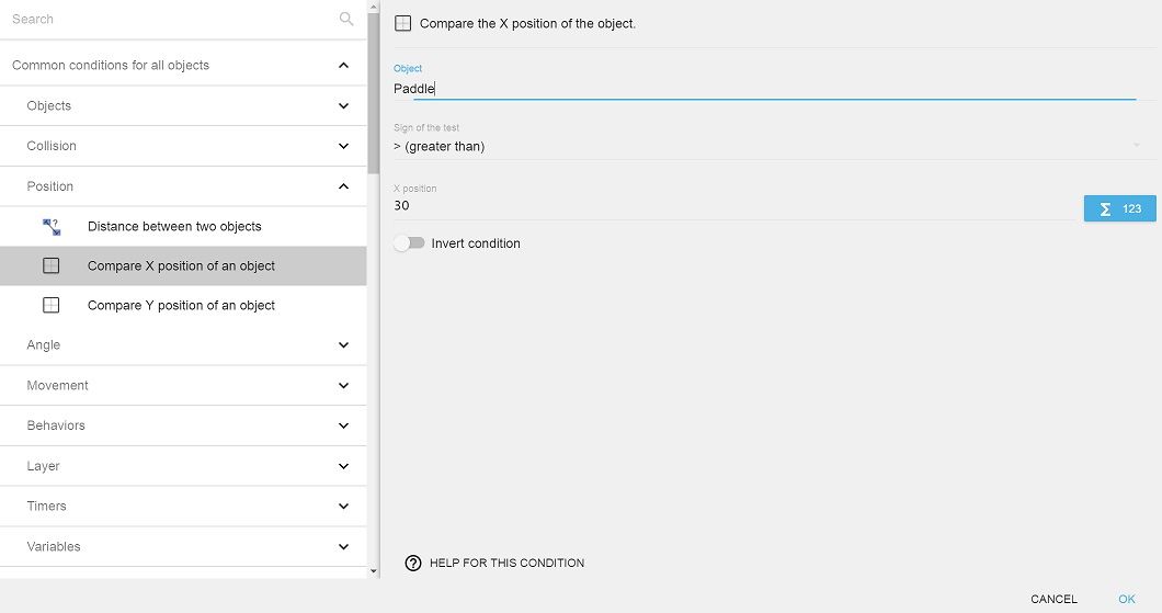 - Haga clic en **Condiciones comunes para todos los objetos > Posición > Posición X de un objeto**.