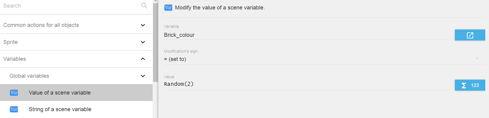 • Agregue otro sub-evento nuevo para el comienzo de la escena, luego haga clic en Agregar acción. * Haga clic en Variables > Valor de una variable de escena. * En el campo Variable, escriba Brick_colour. * En el campo Signo de modificación, seleccione = (fijar a). * En el campo Valor, escriba Random(2). * Haga clic en Aceptar.