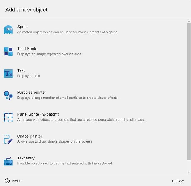 Aparecerá una ventana que muestra diferentes tipos de objetos que puede agregar. Cada tipo de objeto tiene su propio conjunto de características.