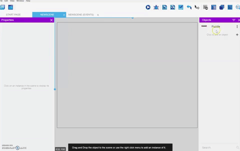 Las escenas contienen objetos que se muestran en la pantalla como contenido del juego. Cada objeto que colocas en una escena se llama instancia. Su juego de breakout tendrá varias instancias del objeto de ladrillo en una escena de nivel de juego. Las escenas también contienen eventos, acciones que ocurren bajo condiciones específicas, para animar la escena.
