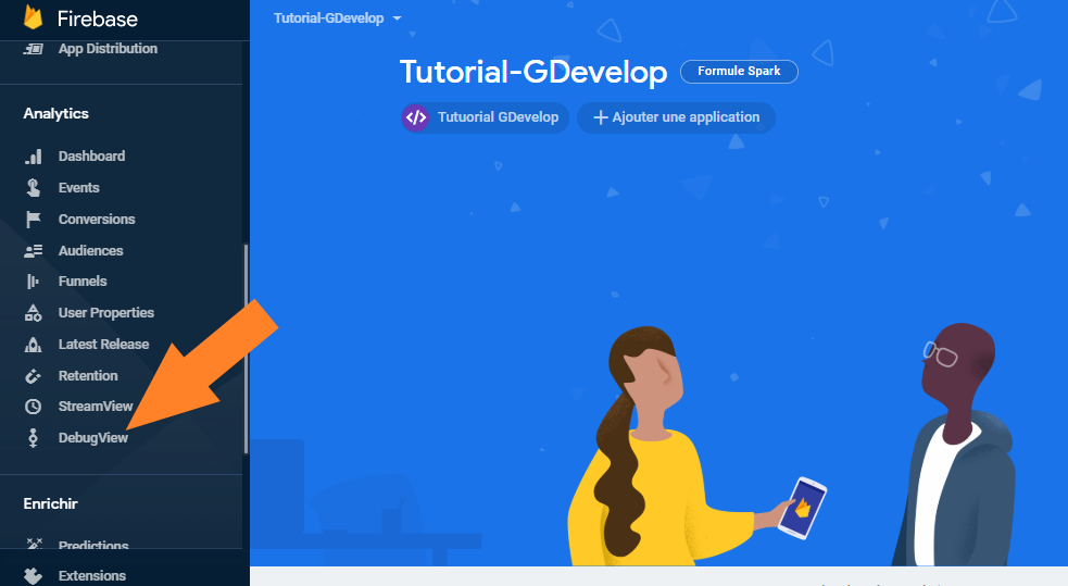Vu que les données n'apparaissent pas très rapidement, comment être sûr que les données sont bien envoyées? D'abord, télécharge l'extension de débogage d'analytics Google. Ensuite, exporte ton jeu vers HTML5. Mets en suite le jeu sur un serveur web (par example Apache, ou si tu as python python -m http.server, etc). En suite va sur le tableau de bord Firebase et sélectionne DebugView: Enfin, navigue ver ton serveur web et active l'extension de débogage an cliquant sur son icône. Ça devrait recharger le jeu, et maintenant il devrait apparaître dans DebugView, et tout les événements et changements de propriétés utilisateur devrait y apparaître avec un délai d'environ 20 secondes maximum.