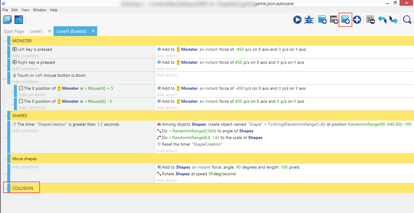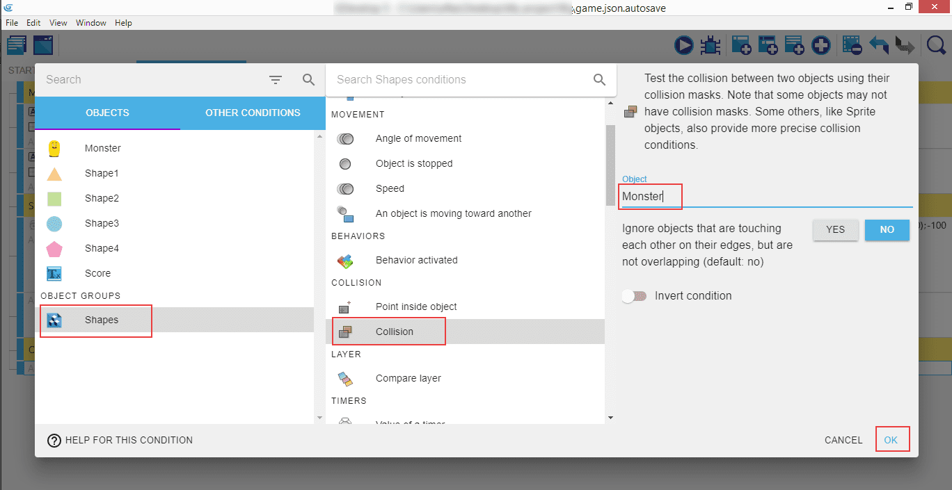 Comme toujours, assurez-vous que Shapes soit sélectionné, puis recherchez Collision (qui testera la collision entre deux objets). Dans le panneau de droite, entrez Monster et cliquez sur OK.
