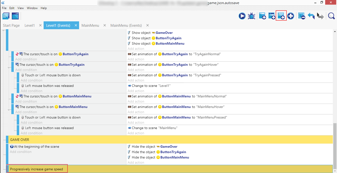 We'll start with the first one. Add a comment "Progressively increase game speed".