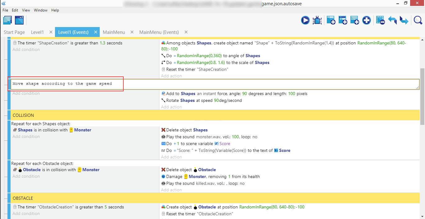 Now we're gonna add the sub-comment for the section about deleting the shape when it's being eaten, and we're going to move the part responsible for increasing the score.