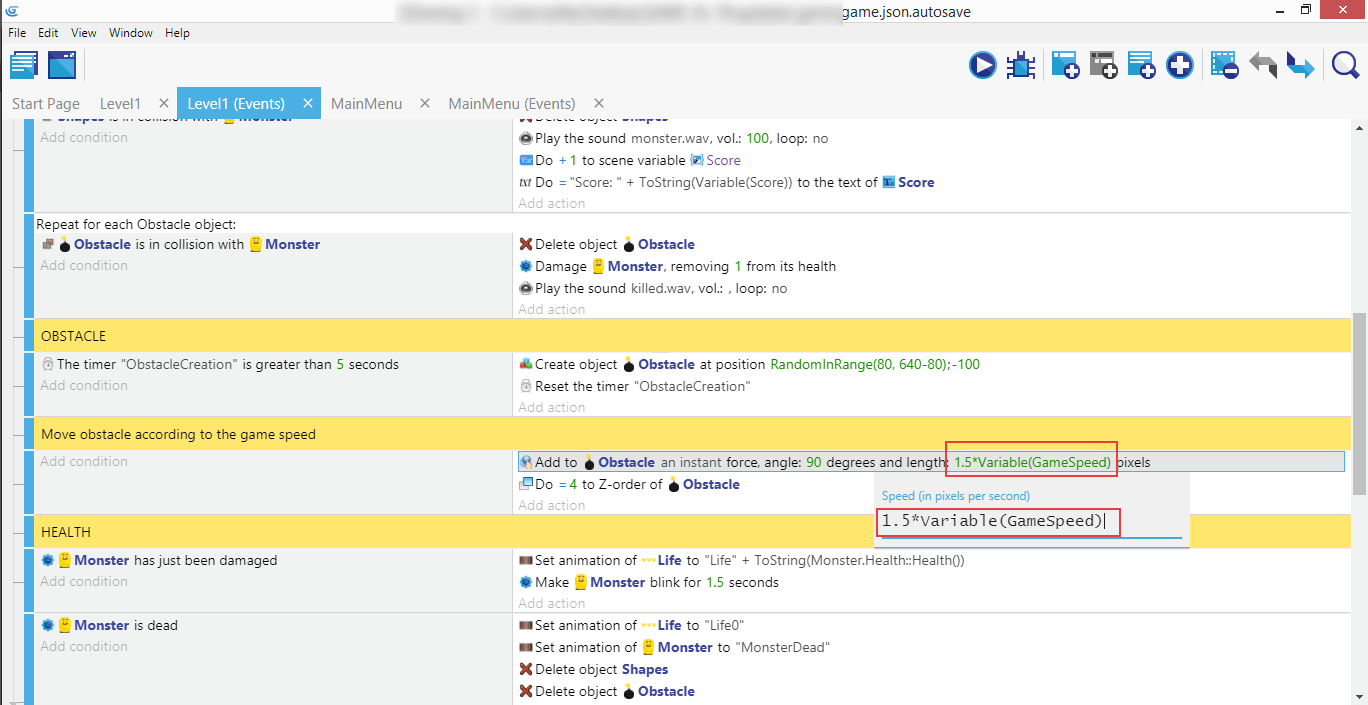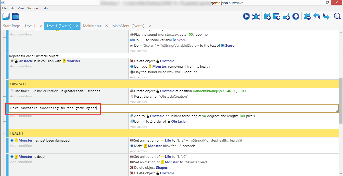 This will be repeated for the bomb obstacle - add a comment "Move obstacle according to the game speed"...