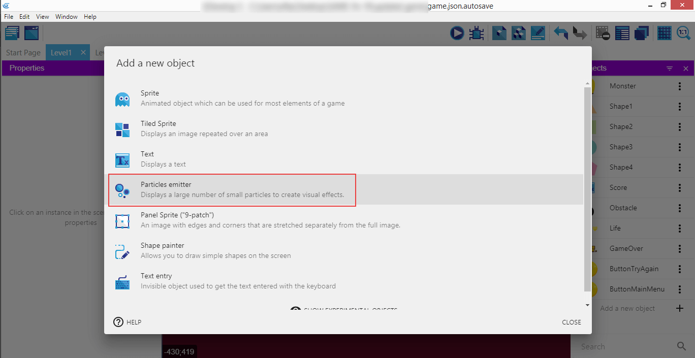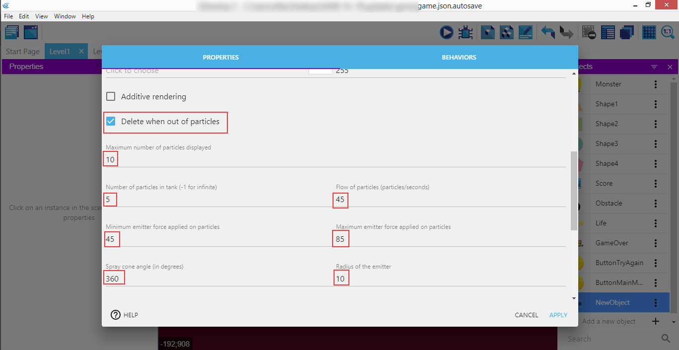 Those emitters will spawn small shapes as particles after the Monster collects it. Object's name will be "Shape1Explosion", kind of particles: "Textured", then select the geometry1.png image, and enter the respective values: start with 20 particles, their height will be 20 pixels, start and end opacity will be 255, so they will be fully visible.