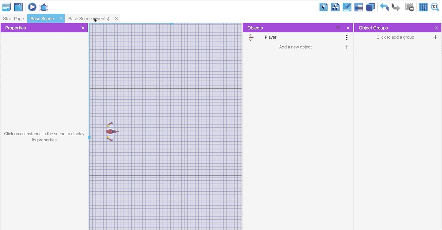Click on the "Base Scene (Events)" tab to open the events editor, where we define the rules of the game using conditions and actions. Click on the event icon to add an empty event.