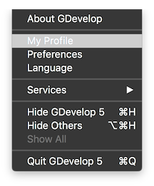 アカウントを持っていない場合は、無料で作成できます。[ファイル]メニュー(Windows および Linuxの場合)または GDevelop メニュー(macOS の場合)から[マイ プロファイル]を選択してください。