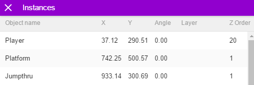 インスタンスエディタには、シーンに存在するオブジェクトのすべてのインスタンスのリストが表示されます。リストから任意のインスタンスを選択して、シーン内のインスタンスの位置、角度、レイヤー、Zオーダーを確認するために使用できます。
