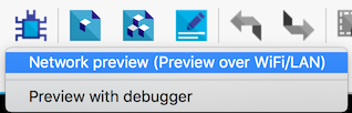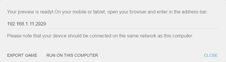 [ネットワークプレビュー(WiFi / LANでプレビュー)]ボタンをクリックすると、エディターと同じネットワークに接続されたモバイルデバイス(または他のコンピューター)でゲームをプレビューできます。