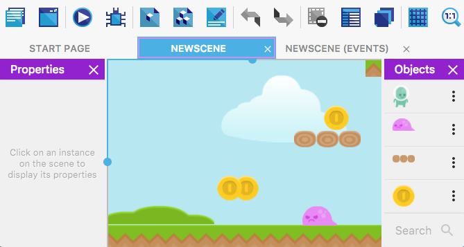 シーンエディタでは、ゲームのレベル、メニュー、インベントリ、またはゲーム内の他の画面を設計および構築できます。シーンエディターを使用すると、オブジェクトを作成してシーンに追加できます。ゲームプレイとゲームのルールは、イベントエディターのイベントを使用して作成できます。