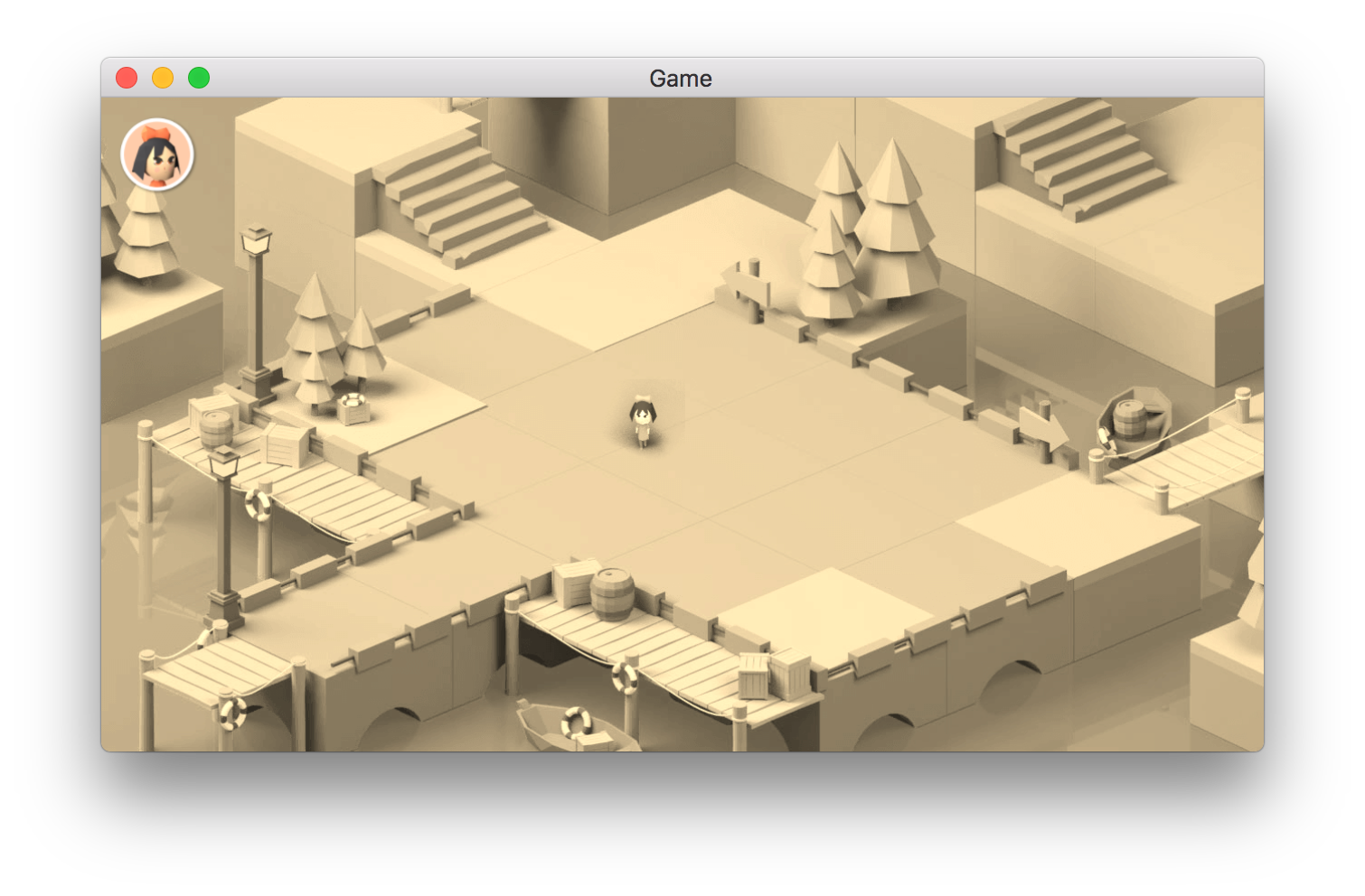 シーンのレイヤーにはエフェクトを追加できます。これらのエフェクトは、ゲームの雰囲気とレンダリング結果をすばやく変更します。たとえばアイソメトリック(斜め見下ろし)ゲームのサンプルに_セピア_エフェクトを追加すると、こうなります。