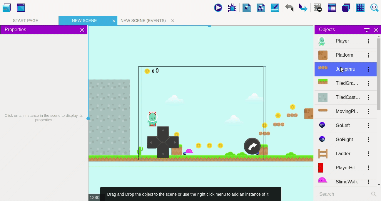 方法はいくつかありますが、一般的なのは[オブジェクト]リストから配置したいスプライトをシーン内にドラッグする方法でしょう。ドロップした場所に新しいインスタンスが追加されます。他の方法としては、[オブジェクト]リスト上で配置したいスプライトを選択状態にしておき、シーン内で右クリックします。コンテキストメニューが表示されるので、[<オブジェクト>のインスタンスを追加]を選択するとインスタンスがシーンに追加されます。スプライトの「インスタンス」は必要な数だけシーンに追加できます。上記の方法を繰り返してもいいですし、配置済みのインスタンスをコピーして貼り付けでも追加できます。