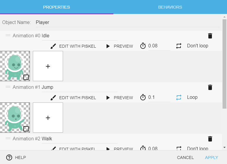 アニメーションを使用すると、1 つまたは一連の画像をスプライトオブジェクトに追加できます。アニメーションを追加するには、アニメーションの追加ボタンをクリックします。