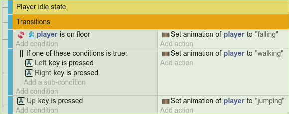 アニメーションに頼らなくても、「状態」専用の シーン変数でプレイヤーの状態を管理することもできます。これはより上級のテクニックですが、自由度は増します。しかしここで説明している、ロジックとそれに対応するアニメーションをセットにするアプローチには、分かりやすさとイベントシートのシンプルさという利点があります。さらに、現在のアニメーション/状態のフレームをチェックして、アニメーション内の特定フレームに差し掛かったときに別のロジックをトリガーするというような高度な分岐処理もできます。