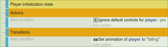 もう見当がつくと思いますが、最初にやることは、この状態に入ったら一度だけジャンプアクションをトリガーすることです。ジャンプするフォースは黙っていてもかかるので、一度ジャンプしたらあとはもうその件について考える必要はありません。毎度のことですが、最後に必要なのは現在の状態から抜けるための条件設定です。今回の場合は、プレイヤーが「ジャンプ中ではない」ことと「落下中ではない(地面の上にいる)」ことをチェックします。どちらかに当てはまっていれば、「落下」状態に移行します。