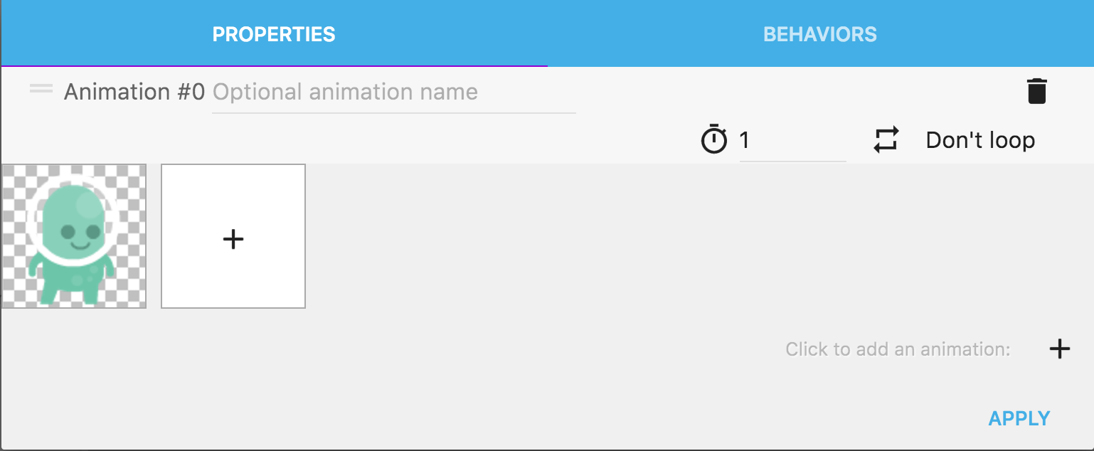 オブジェクトは今のところ空です。スプライトオブジェクトはアニメーションで構成され、各アニメーションには1つ以上の画像を含めることができます。アニメーションを追加しましょう!「+」ボタンをクリックします。