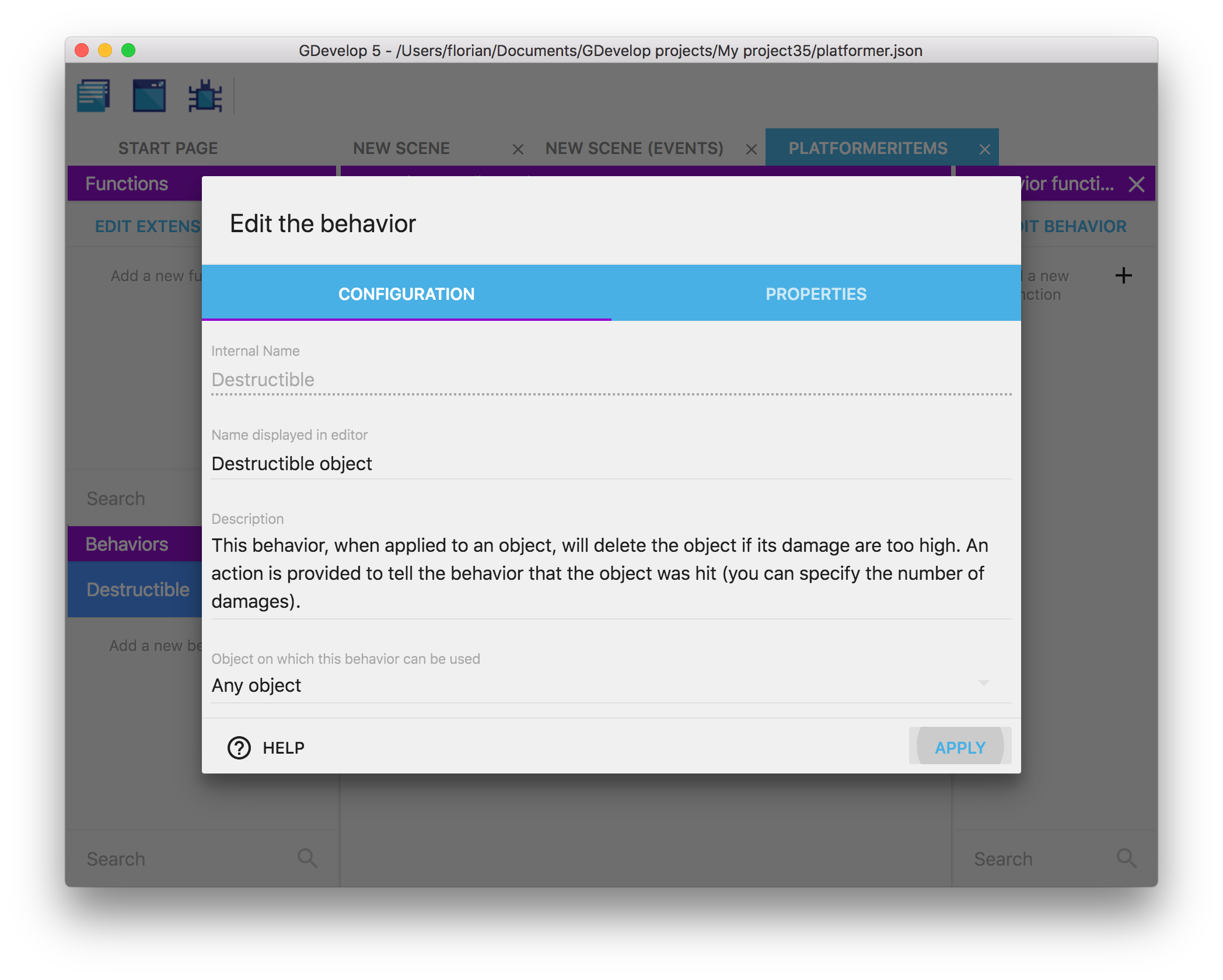 Here, you can see the "Destructible Object" behavior for example (that was created in the previous screenshots):